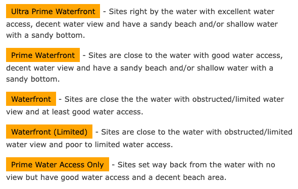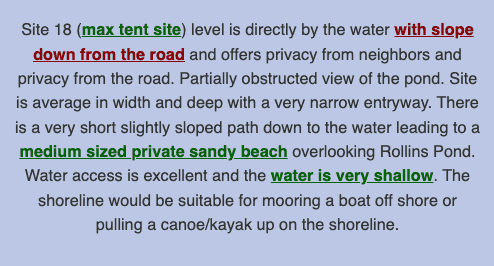 Search for specific types of watersites for any campground, list of campgrounds or regions that match your criteria. For example "Show me all watersites in the Adirondacks that are directly by the water and have at least a medium size sandy shallow beach".