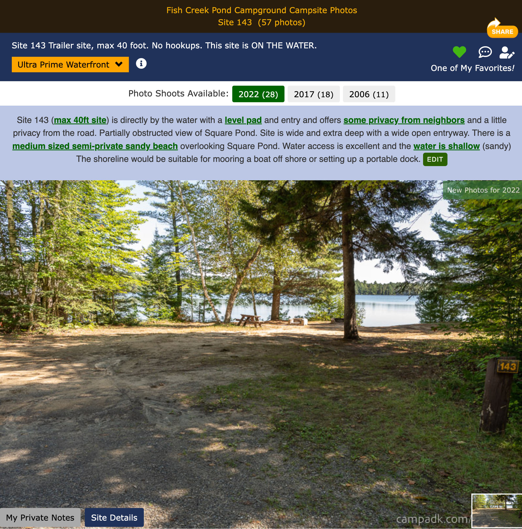 Different options for viewing campsite photos such as swipe left/right, navigate to photos by category button (ie views from road, fireplace view, path to water, shoreline, shoreline views, looking back to road, view down the road).